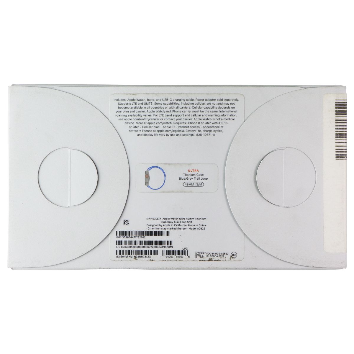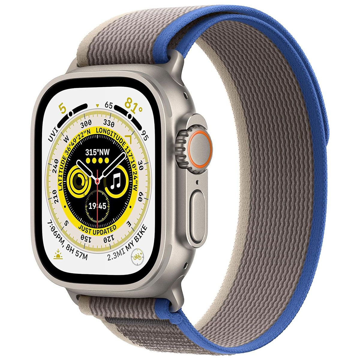The Official Apple Watch Ultra 49m Titanium Smartwatch. Model: A2622. GPS + LTE. Titanium finish with Blue & Gray Trail Loop (S/M) Small/Medium Size.